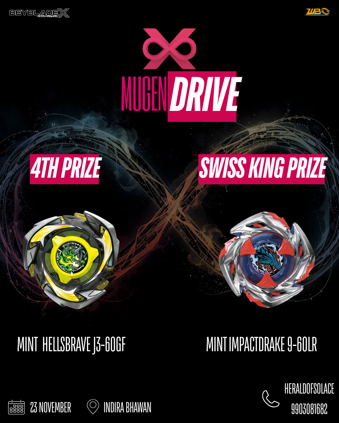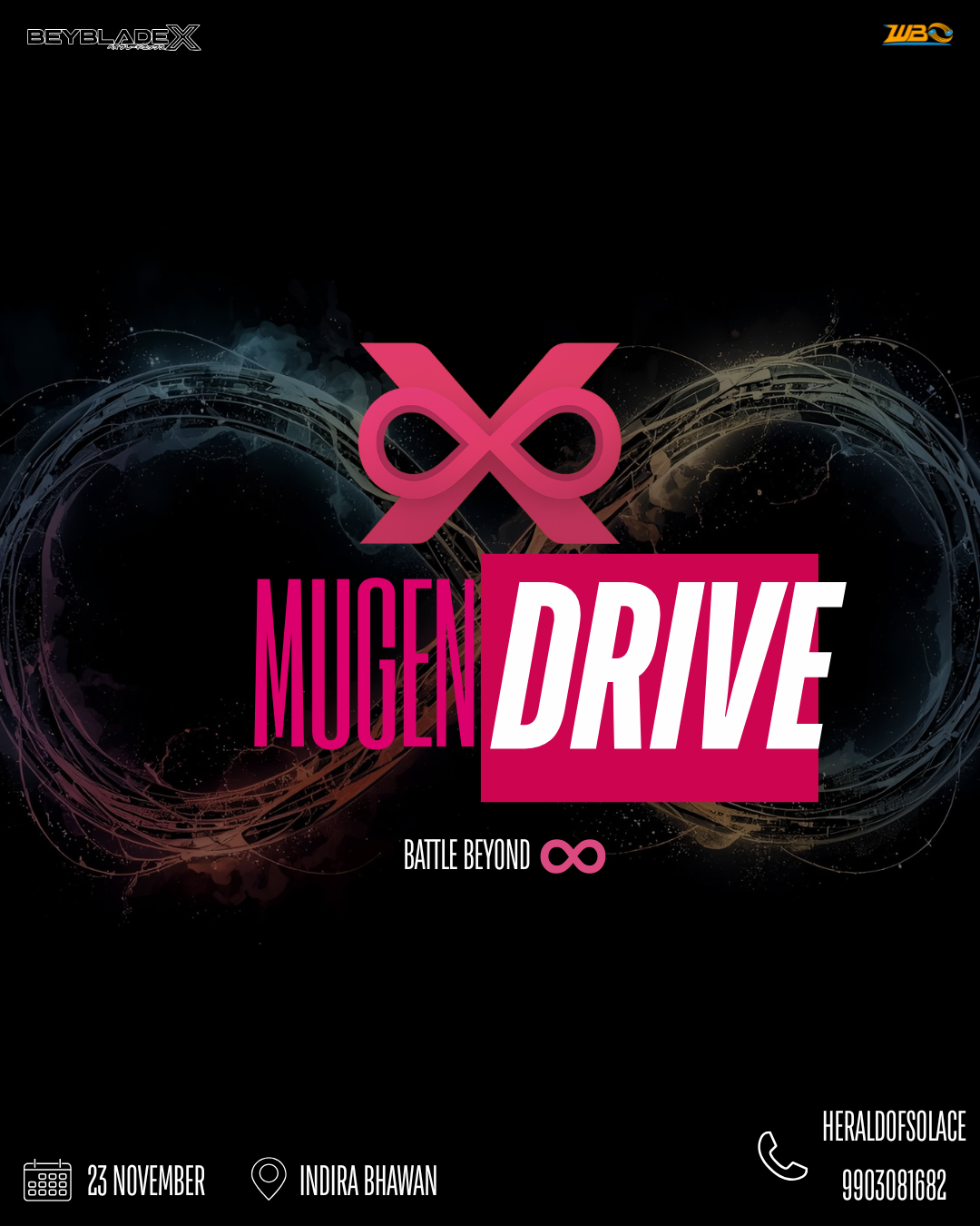 Enter the arena where legends are made. Mugen Drive is the India’s first Beyblade tournament in the Infinity Stadium. If you crave speed,  and dominance, and watching your beys dance on the Xtreme line, good news: now there are two of those. Every launch counts, every spin defines your legacy. Only the strongest will rise — the rest will fade into the dust.